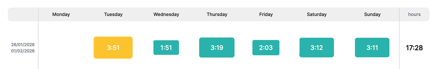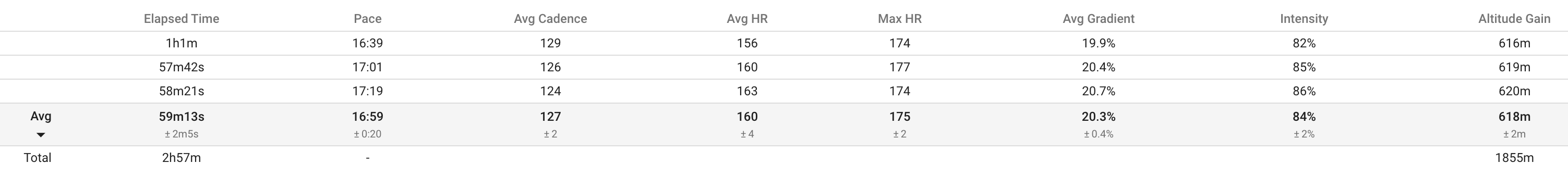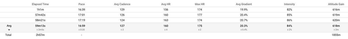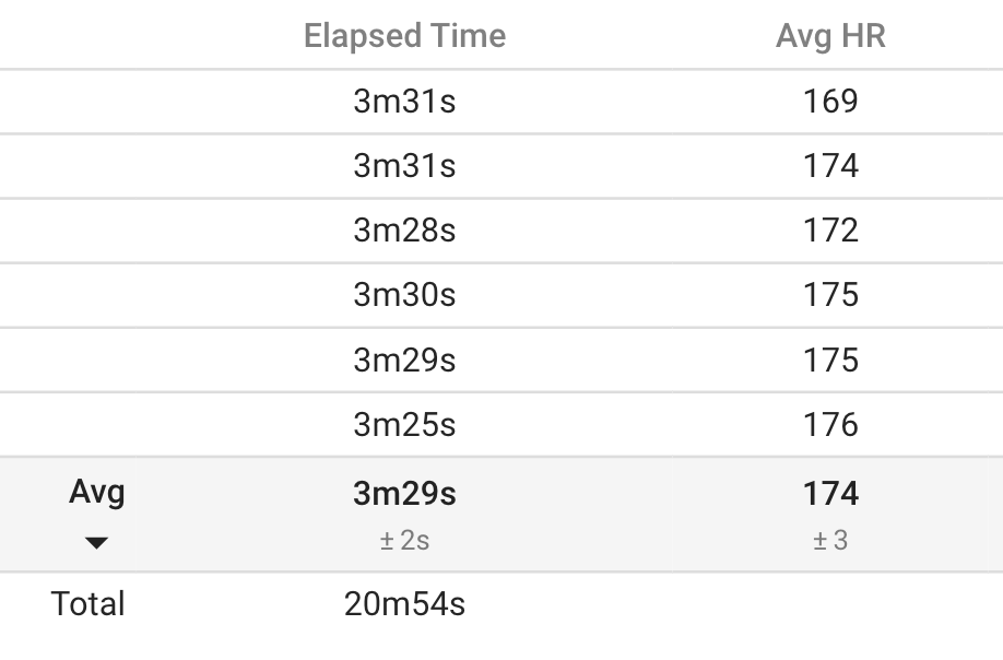 Oggi ho sperimentato un doppio poco ortodosso: lungo collinare al mattino e ripetute la sera. Sui 1.000 con la squadra ho tenuto un ritmo costante di 3:30/km con un cardio contenuto (probabilmente soppresso). Concludo ill workout molto meglio di come potessi aspettarmi, sia come dati crudi sia a livello di sforzo percepito.