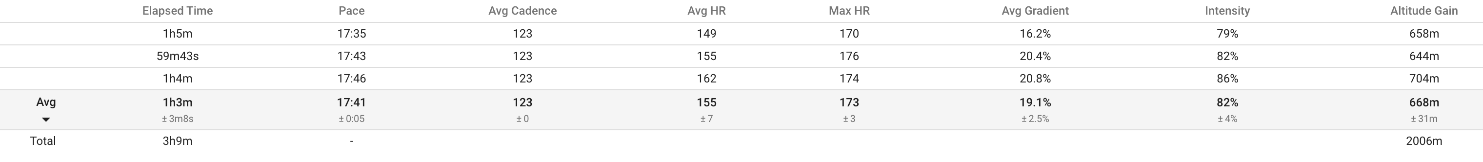 Come la scorsa settimana 3x ~650m d+. A rileggere velocemente i dati scopro di avere abbassato notevolmente il cardio ed allo stesso tempo migliorato i tempi di risalita (sempre intorno all’ora con 50-100m d+ aggiuntivi), segno che comincio a muovermi meglio con gli sci in salita.