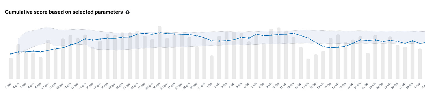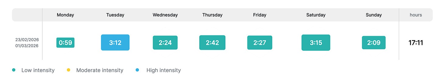 Finita un’altra settimana di costruzione. Obiettivi a lungo termine sono svaniti ed obiettivi a breve sono sbocciati all’improvviso. Una svolta inattesa che, nonostante l’amarezza per un TOR per ora sfumato, mi gasa e motiva ad affrontare marzo al meglio. questa settimana pone fine al blocco di costruzione aerobica, ora entro in un mese di allenamenti più specifici dedicati alla 100 km in Toscana.